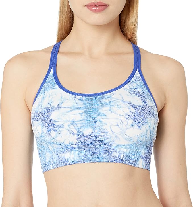 Športová podprsenka v modro-bielej farebnej kombinácii s modernou potlačou. Poskytuje stredne silnú podporu vhodnú pre rôzne športové aktivity. Racer-back dizajn zabezpečuje voľnosť pohybu v ramenách. Priedušný materiál odvádza pot a rýchlo schne. Ideálna na jogu, pilates, tréning alebo bežné nosenie.